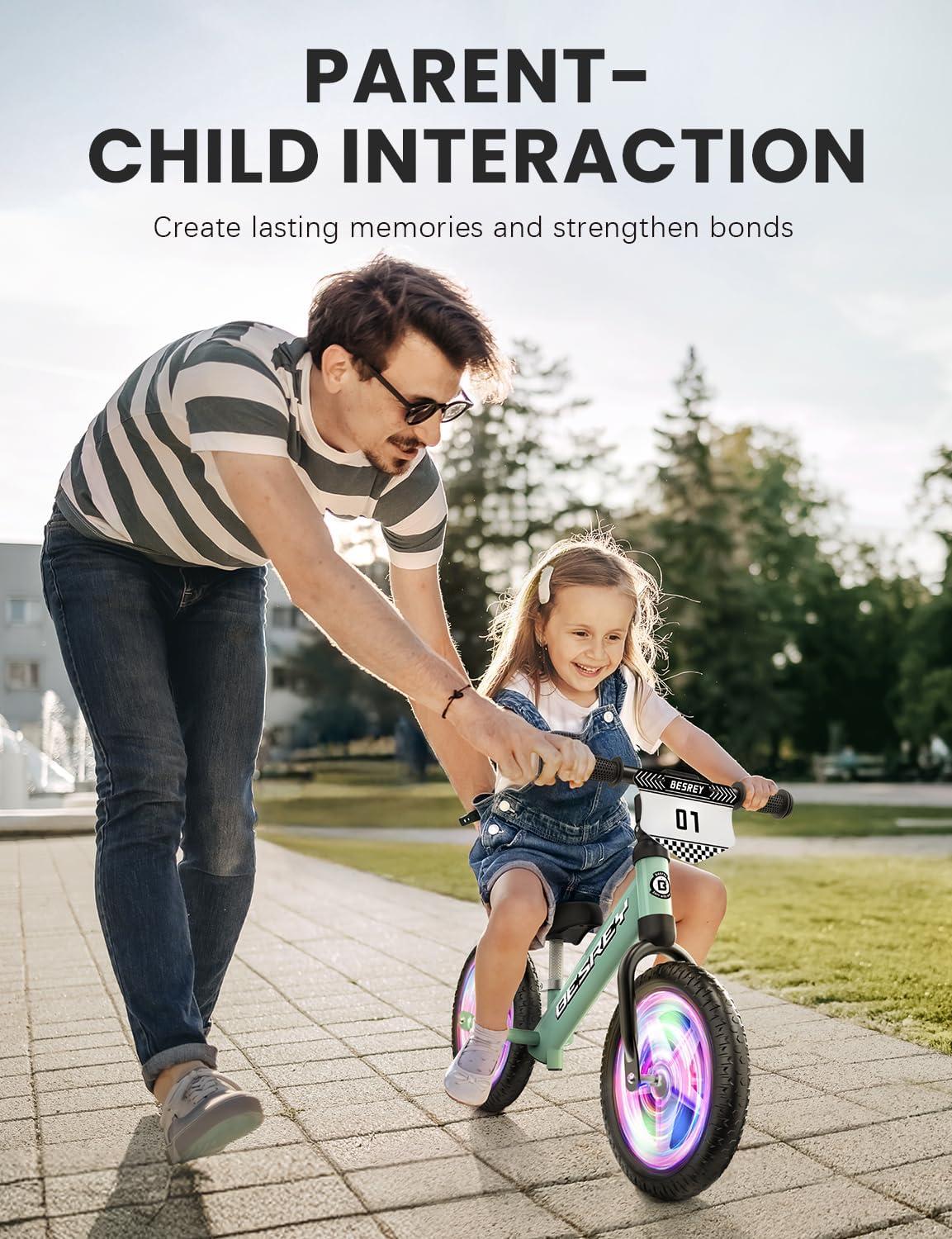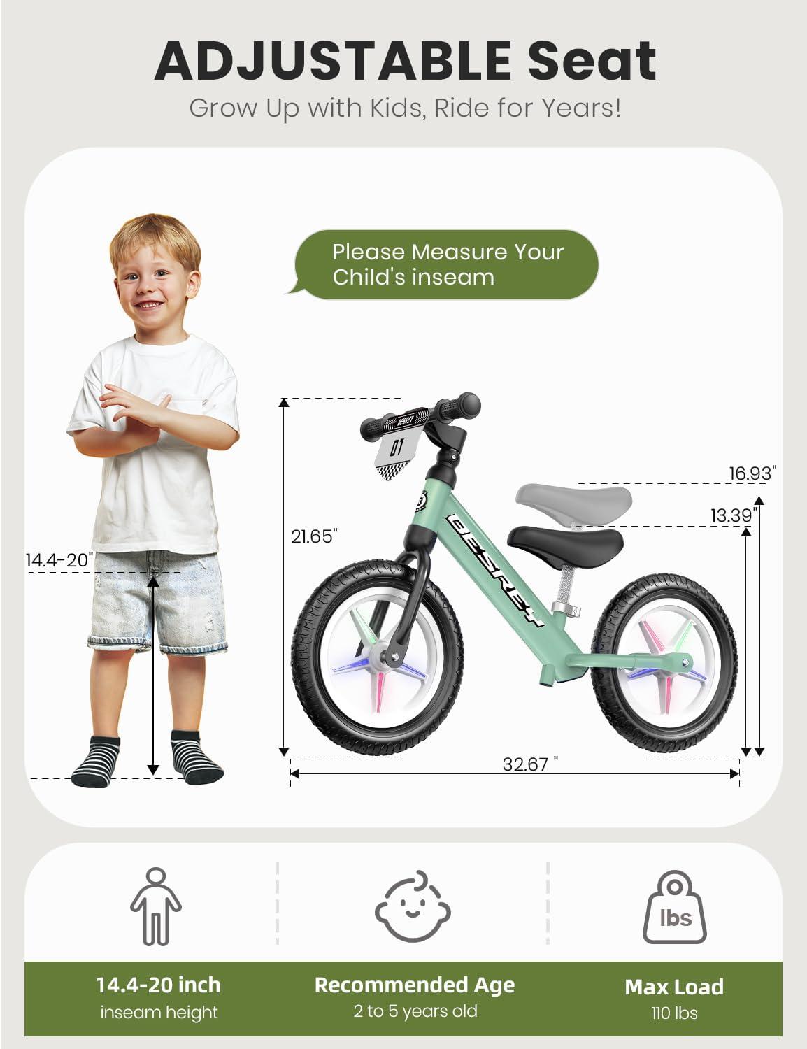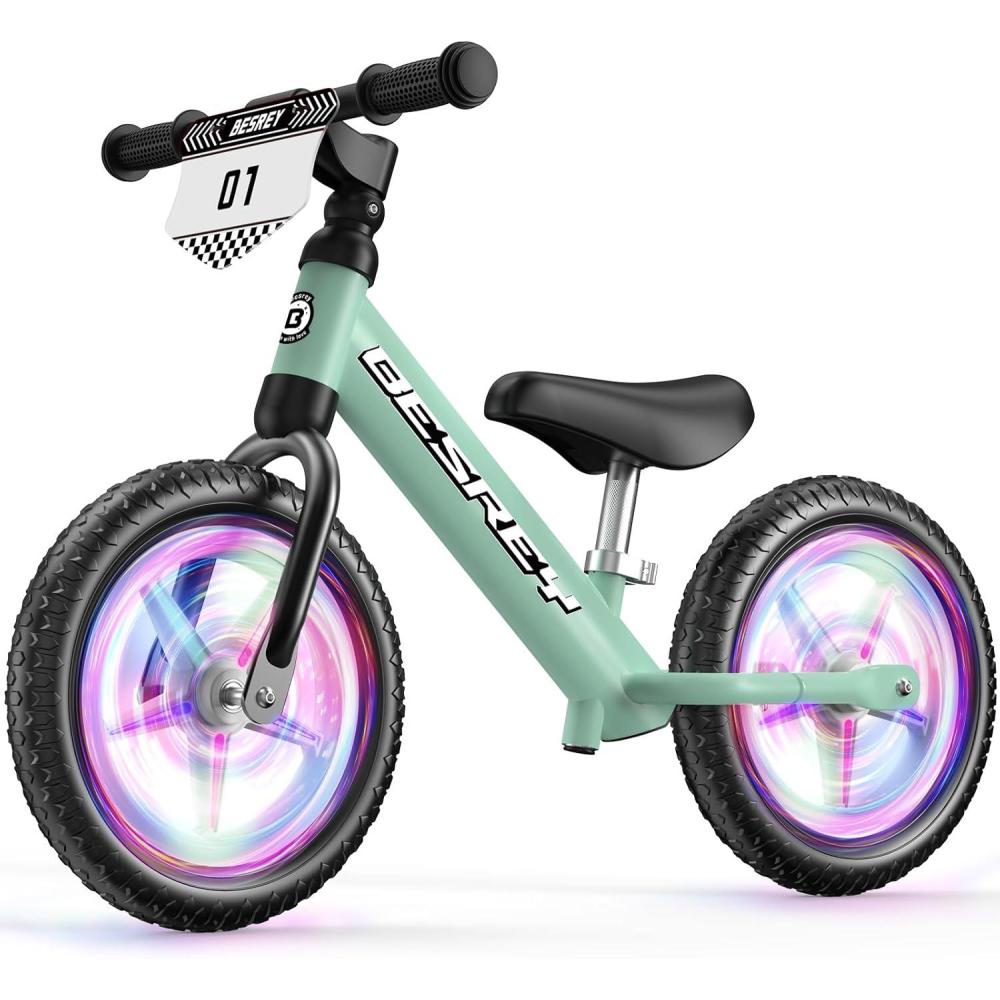 besrey Toddler Balance Bike 2 Year Old, All-Metal Frame | 12" Motion-Activated Lighting Wheels | All-Terrain | Kids Bike with Padded Adjustable Seat | Gift Bike for Boys Girls 2 3 4 5 Years Old(Green)