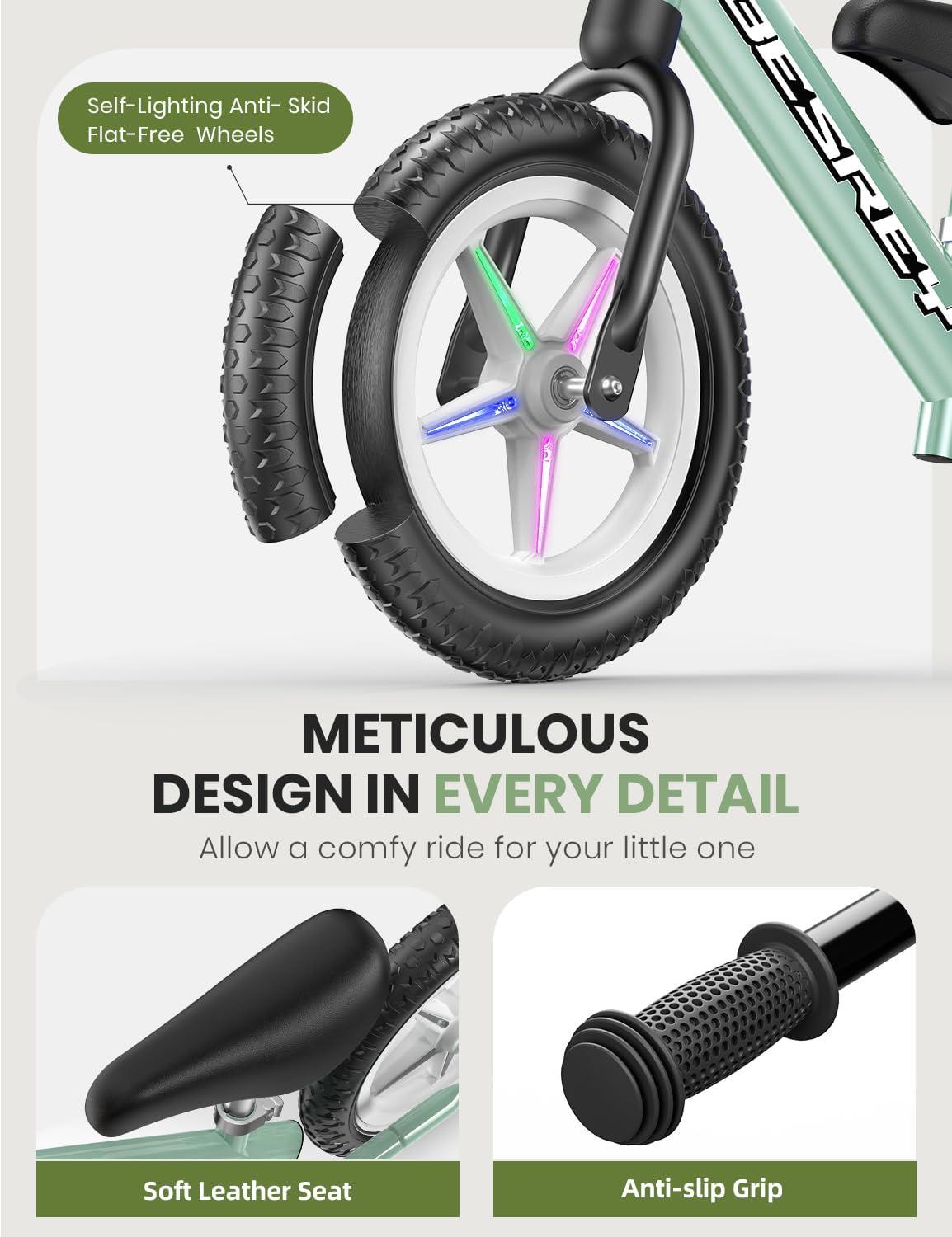 Self-Lighting Wheels, No Batteries!: The colorful glow wheels of this toddler balance bike activate magically with motion – just ride and watch them light up! The cool lights bring added excitement, making playtime even more fun and engaging for children (No battery waste & battery costs. The self-lighting wheels of our balance bike are equipped with built-in light beads, which are more stable and durable than the external light beads of other products.