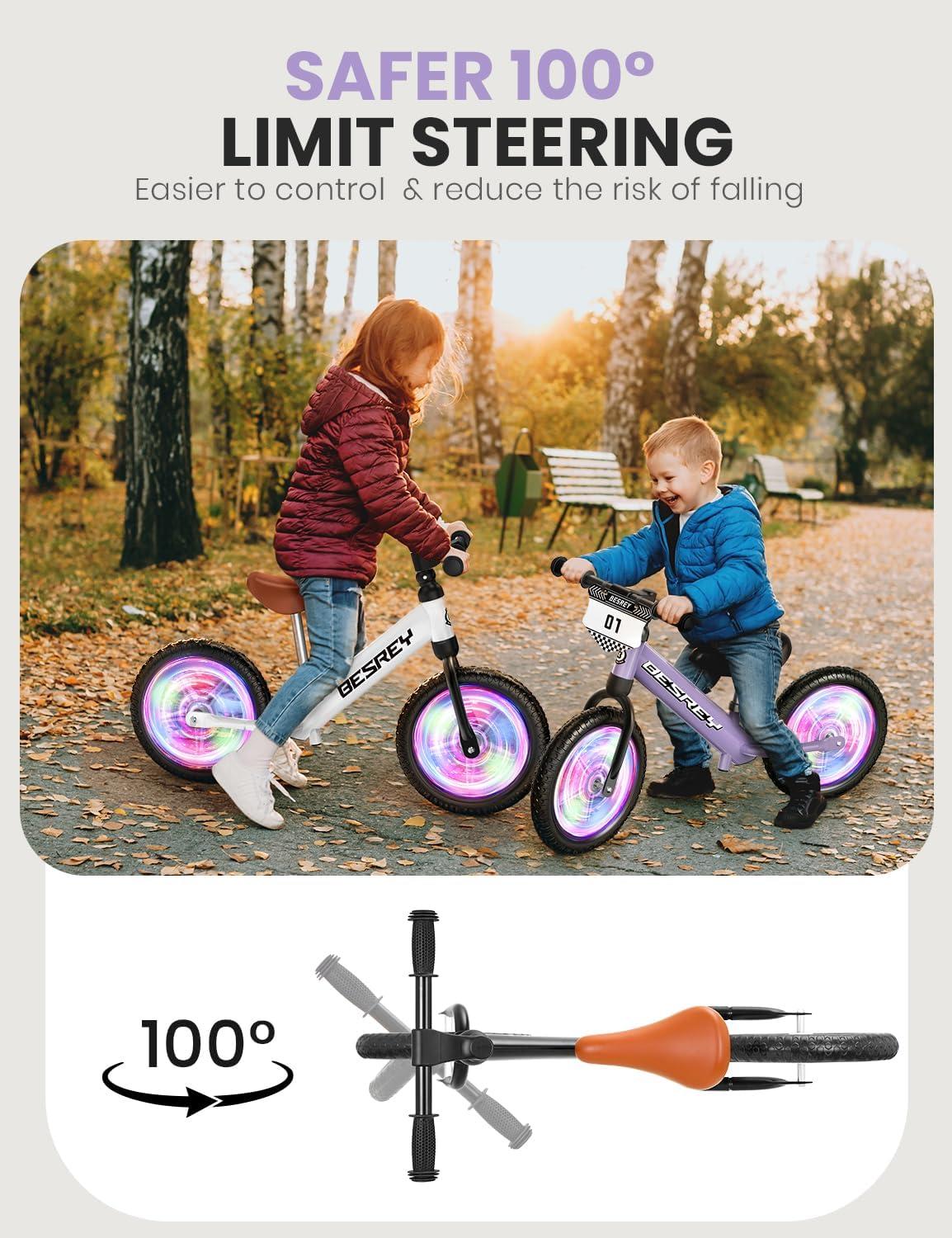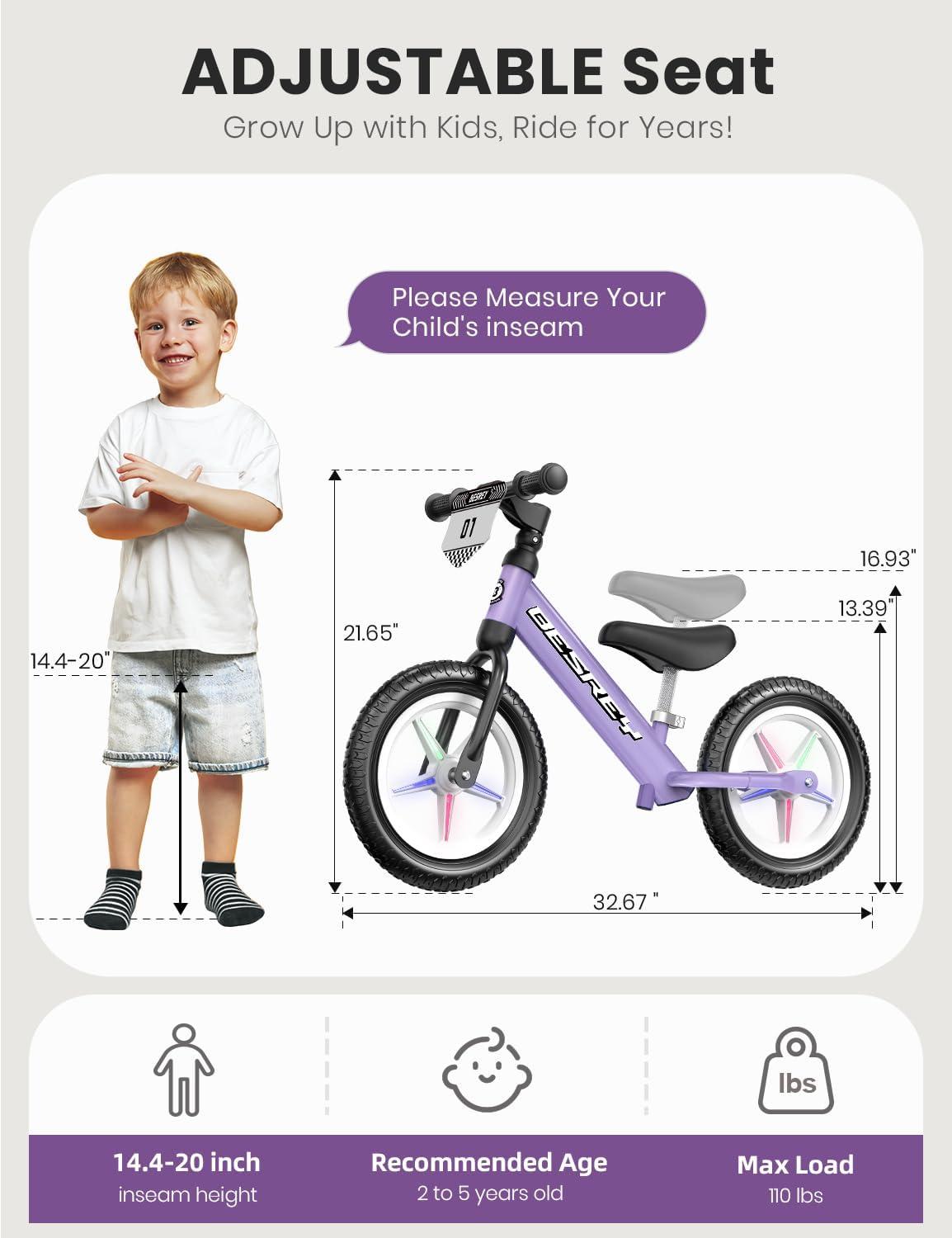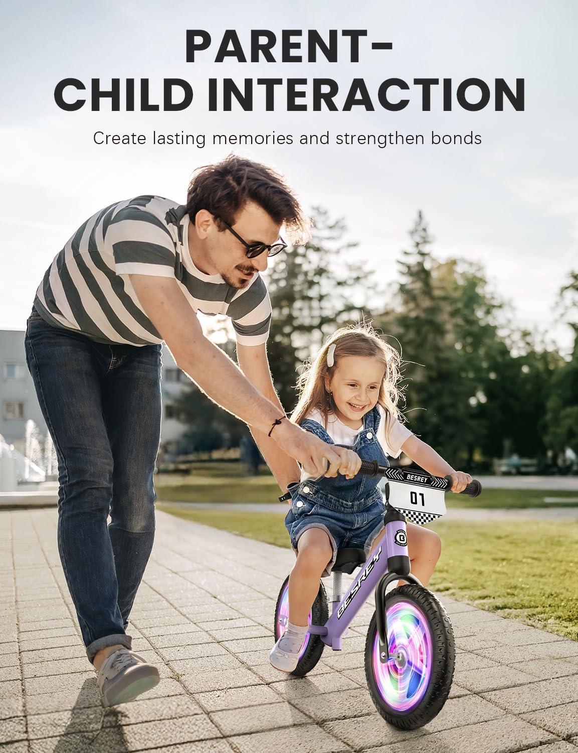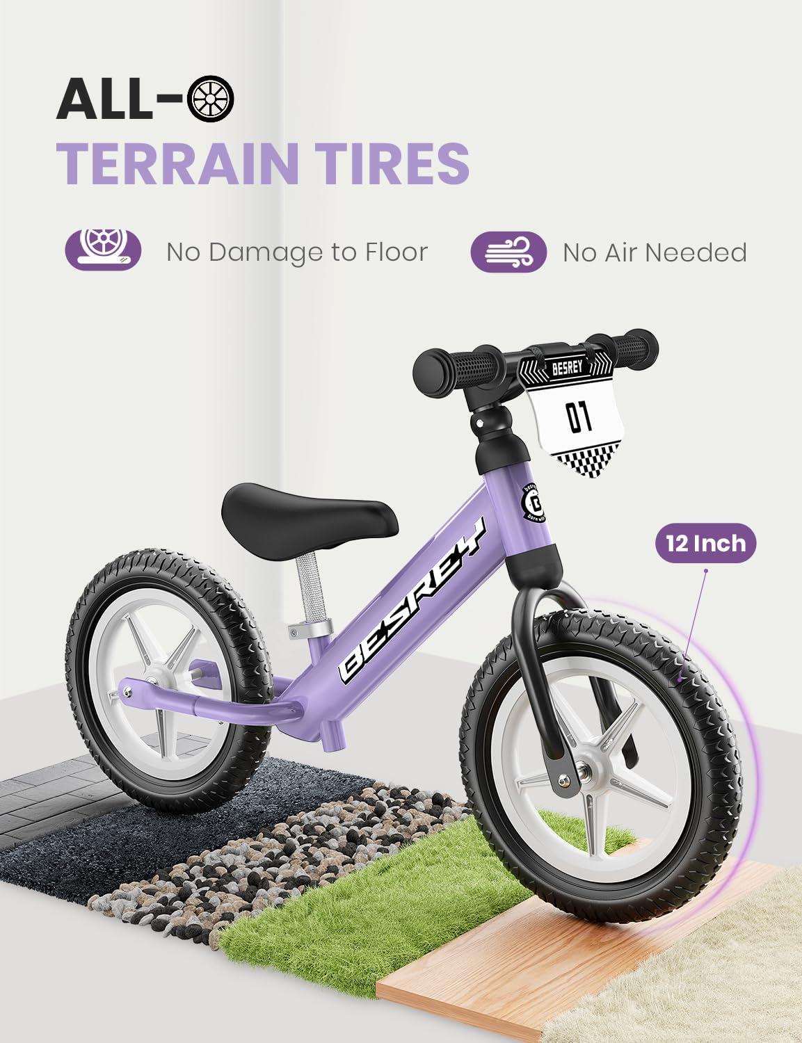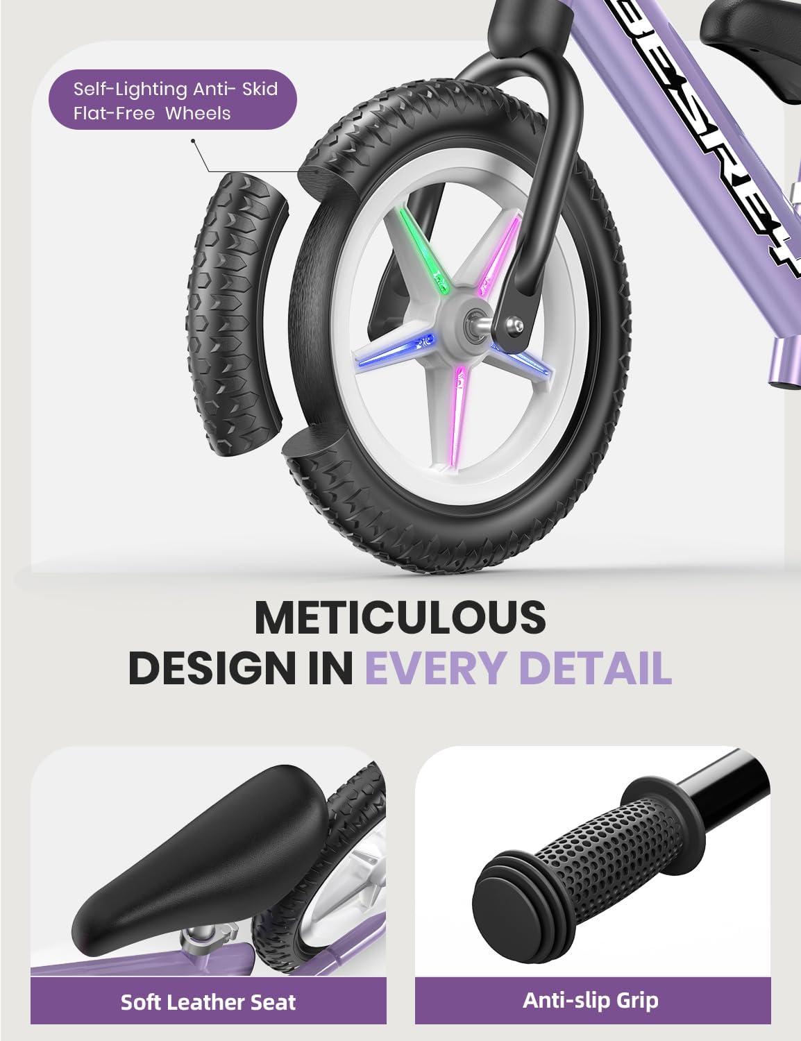 besrey Toddler Balance Bike 2 Year Old, All-Metal Frame | 12" Motion-Activated Lighting Wheels | All-Terrain | Kids Bike with Padded Adjustable Seat | Gift Bike for Boys Girls 2 3 4 5 Years Old(Purple)