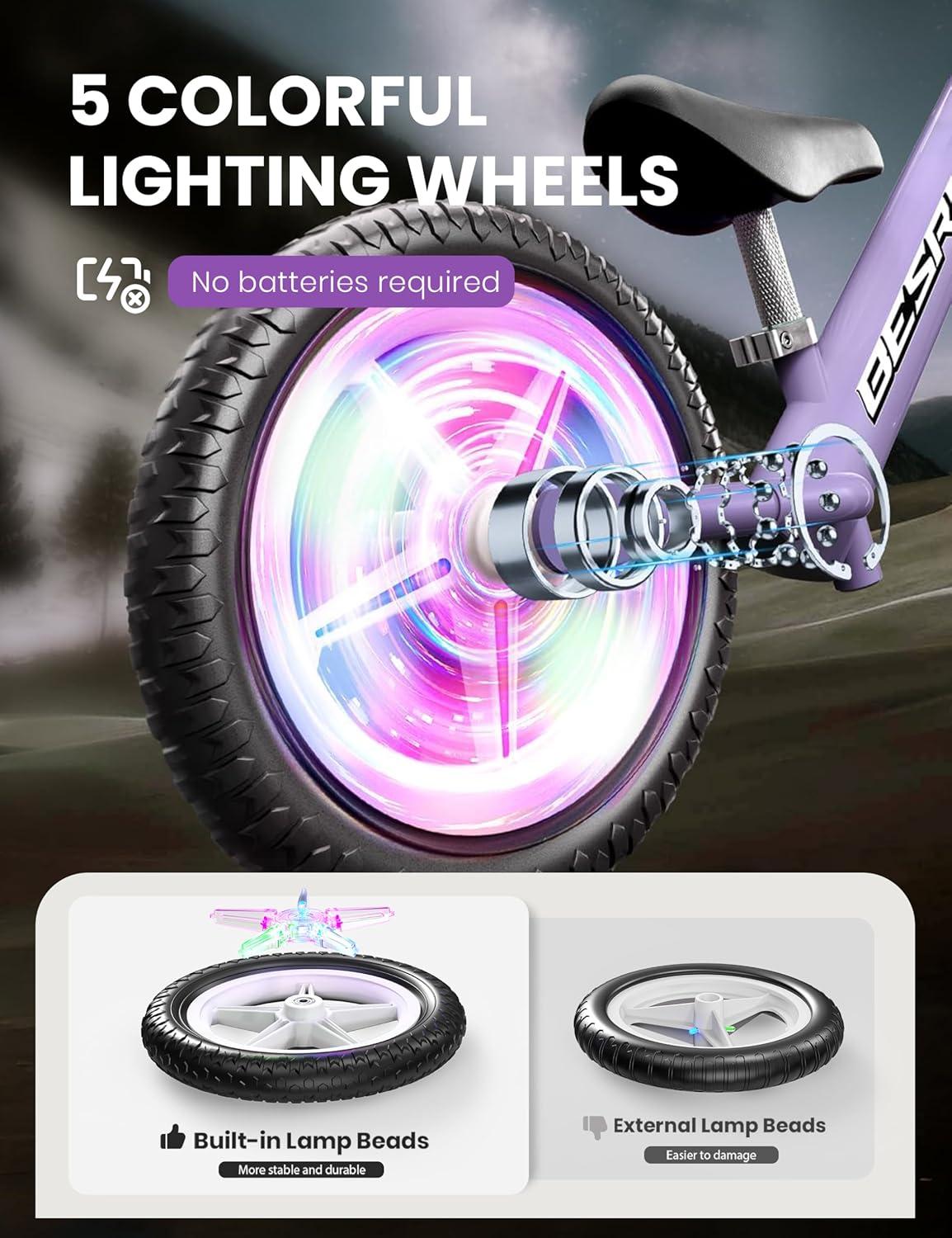 Self-Lighting Wheels, No Batteries!: The colorful glow wheels of this toddler balance bike activate magically with motion – just ride and watch them light up! The cool lights bring added excitement, making playtime even more fun and engaging for children (No battery waste & battery costs. The self-lighting wheels of our balance bike are equipped with built-in light beads, which are more stable and durable than the external light beads of other products.